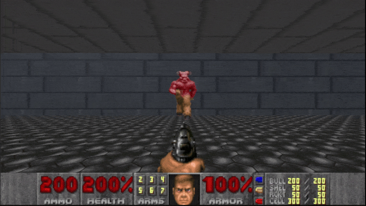 I also spent more time thinking about how to implement the guns, ensuring that all weapons could be created using shared base logic. This allowed me to eventually implement all the guns from the original game. I did a lot of research into how DOOM’s weapons and HUD worked so I could recreate them as closely as possible, both in logic and animation. This time around, I used coroutines and state-based logic, which made animating the weapons much easier. All weapons are rendered as sprites on the canvas, which worked well but sometimes required careful alignment to make them look right.