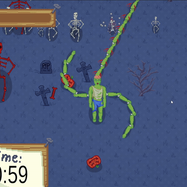 In this game, you play as a zombie fighting off endless waves of hostile skeletons in a graveyard. When a skeleton is defeated, you can grab its bones and attach them to yourself, either adding extra limbs or strengthening the ones you already have. These additional limbs are fragile, if you’re not careful they can be destroyed.